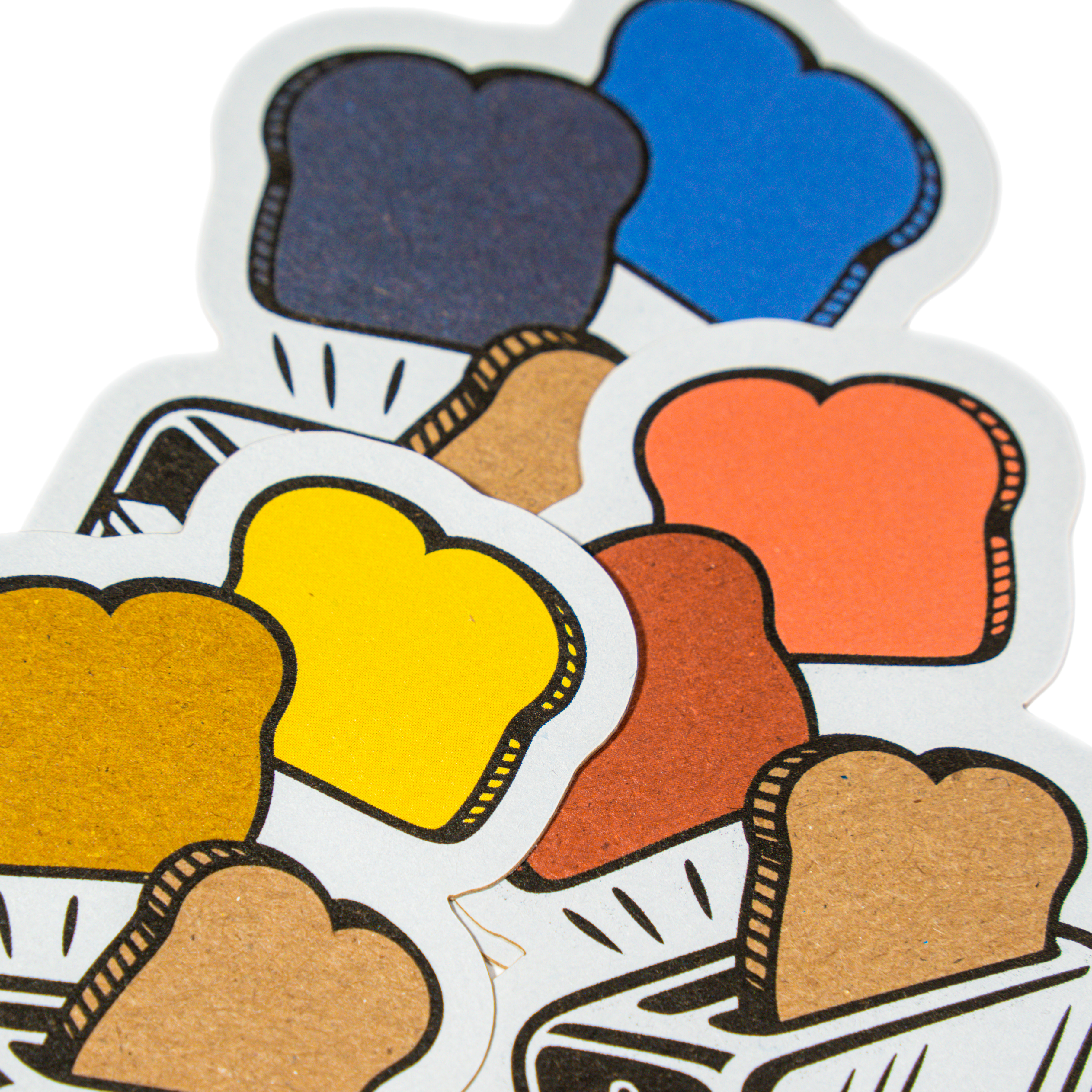 1. Colorful die cut sticker featuring a toaster with popping slices of bread in different colors, arranged as a small sticker stack