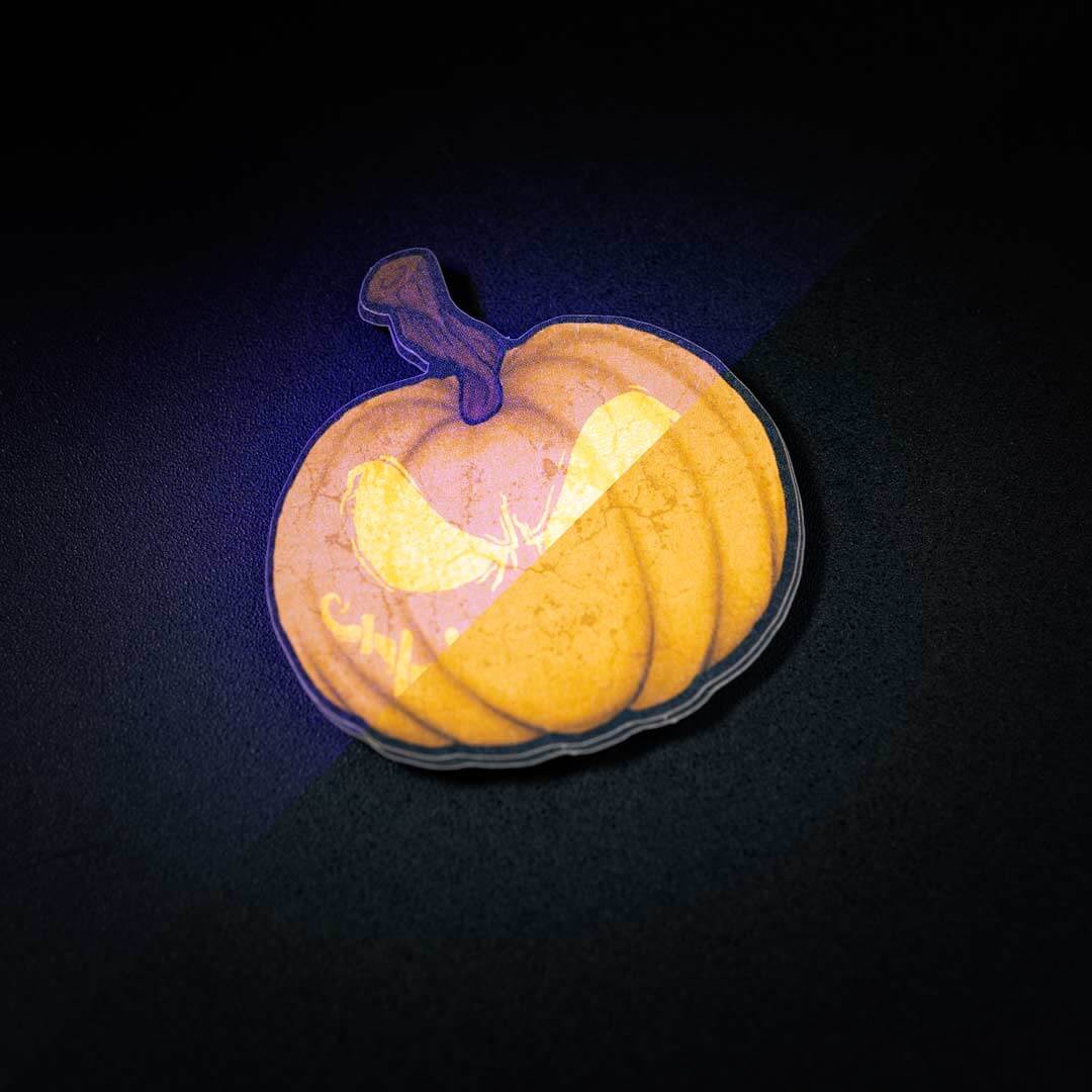 Füge eine heimliche Nachricht, coole Effekte und gruselige Überraschungen mit unsichtbarer UV Tinte zu deinem Sticker Design hinzu.