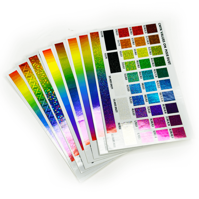 Erlebe unsere maßgeschneiderten Aufklebermaterialien, Laminierungen und CMYK-Farbpaletten, die alle in diesem Musterpaket für 2 € enthalten sind.